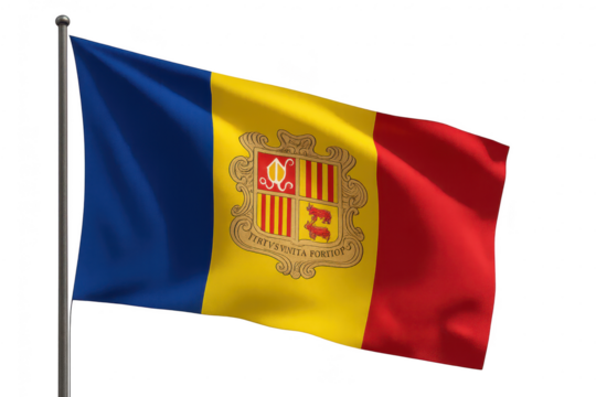 Flag of Andorra waving on a transparent background with pole detail.