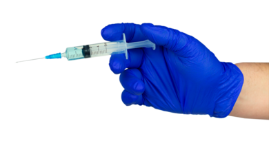 Hand in blue glove holding syringe with copy space. Syringe with sharp needle in hand. Medical treatment concept. Laboratory backgrouund.  Vaccination concept, isolat