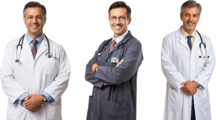 A smiling female doctor wearing a white lab coat and stethoscope, arms crossed, isolated on transparent background