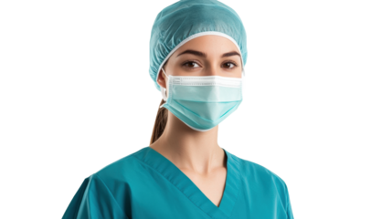 Professional surgeon in scrubs and mask ready for operation with arms crossed confidently isolated on transparent background