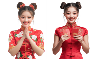 asian woman wearing red traditional cheongsam dress holding red envelopes or ang Pao isolated on transparent background