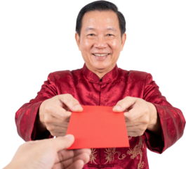 Happy Asian Man in Traditional Cheongsam Giving Red Envelope (Ang Pao) for Chinese New Year Celebration Isolated on White Background