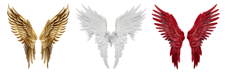 Set of white gold red, angel devil wings on transparent background cutout, PNG file. Mockup template for artwork graphic design
