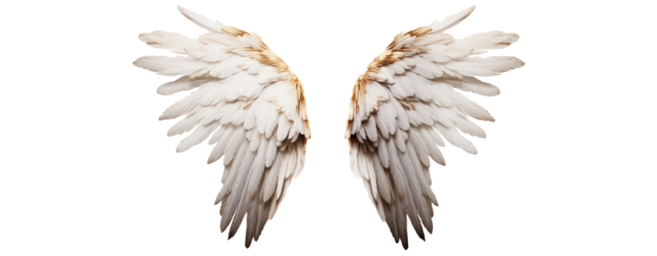 Two white angel wings isolated on a transparent background, top view.