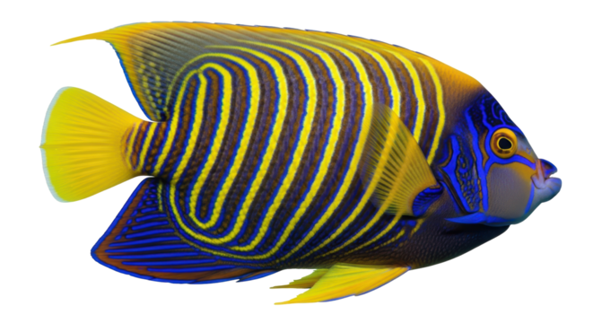 Regal angelfish swimming, showing vibrant blue and yellow stripes, isolated on transparent background