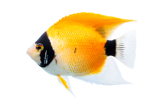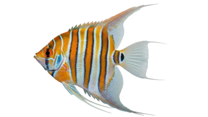 striking angelfish with bold patterns swimming gracefully. Its vibrant orange and black stripes create stunning visual against transparent background, showcasing its beauty and elegance