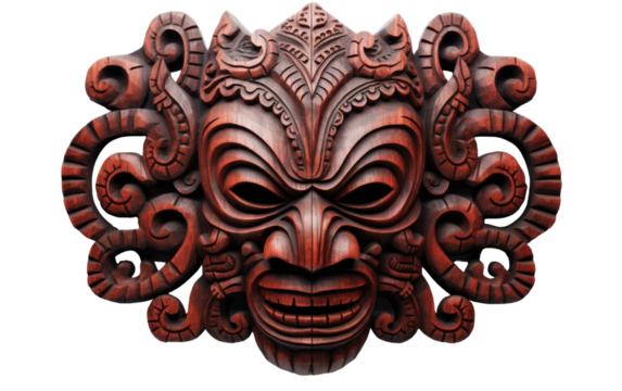 A sinister wooden mask portraying a demon face, exuding dark energy and menace