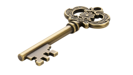Antique brass key PNG isolated on transparent background, vintage ornate skeleton key for design elements and security concepts
