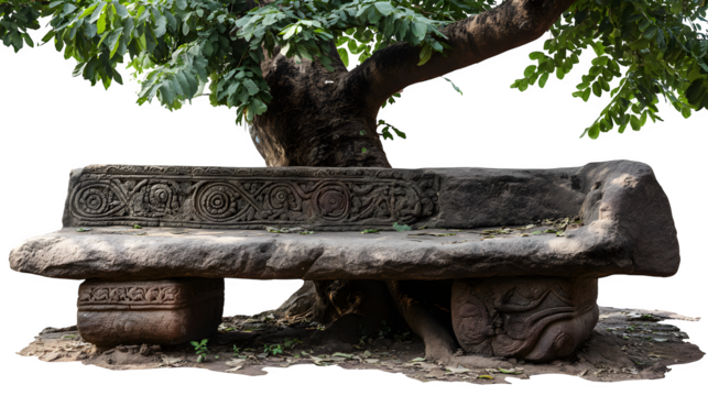 A traditional village stone bench carved with local motifs, situated under a spreading tree, isolated on a Transparent background