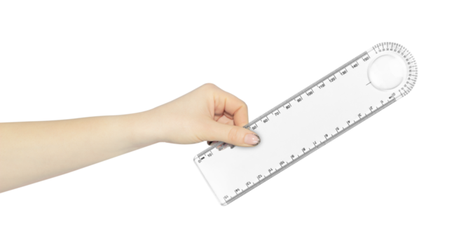 Photograph of white gloved hand holding an angle measuring tool used in woodworking, isolated on transparent background png file.