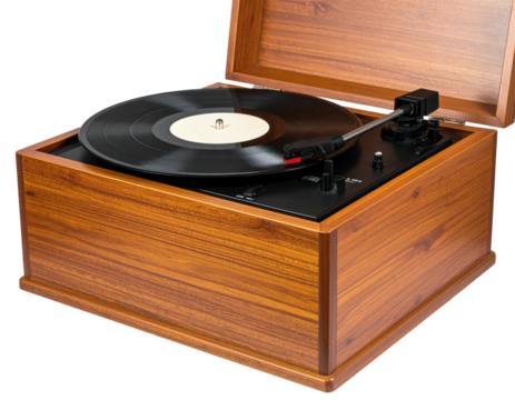 Classic wooden turntable plays a vinyl record with the lid slightly open