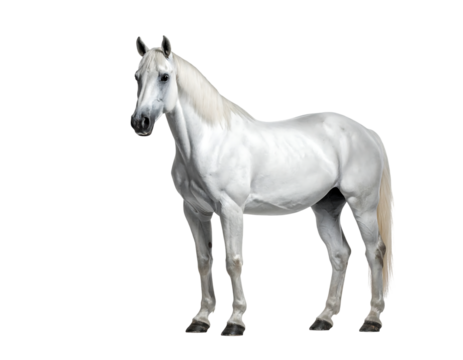 A light gray horse stands facing forward, slightly angled left, against a black background. Its mane and tail are a lighter shade than its body.  The horse is well-muscled and appears healthy