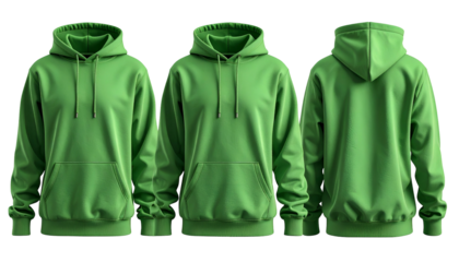 Three-view image of a plain, green hooded sweatshirt showing front and back