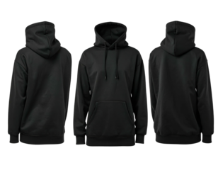 Front, back and angled views of a plain black hooded sweatshirt against a black background