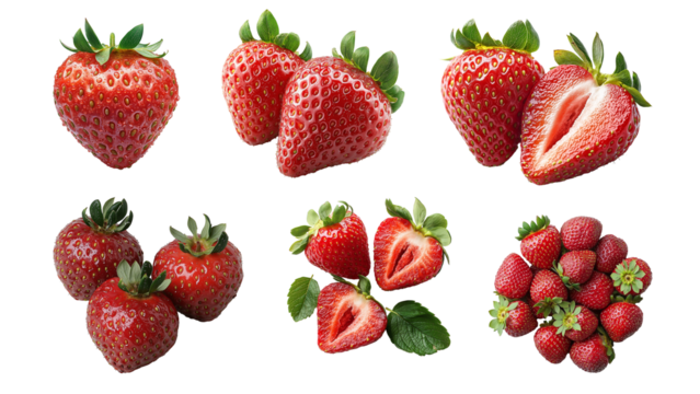Strawberry collection, strawberry cut in half, strawberry group isolated on transparent background. PNG. Cutout