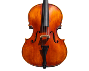 A cello shown from an angled side perspective as if leaning against an invisible stan