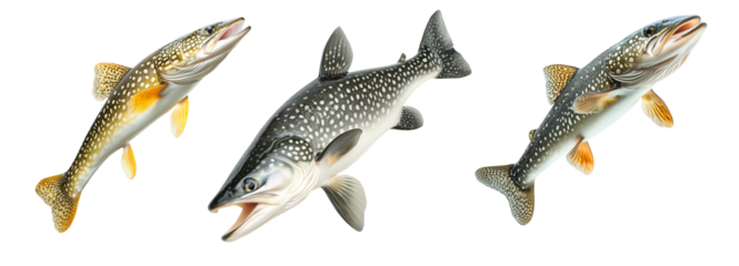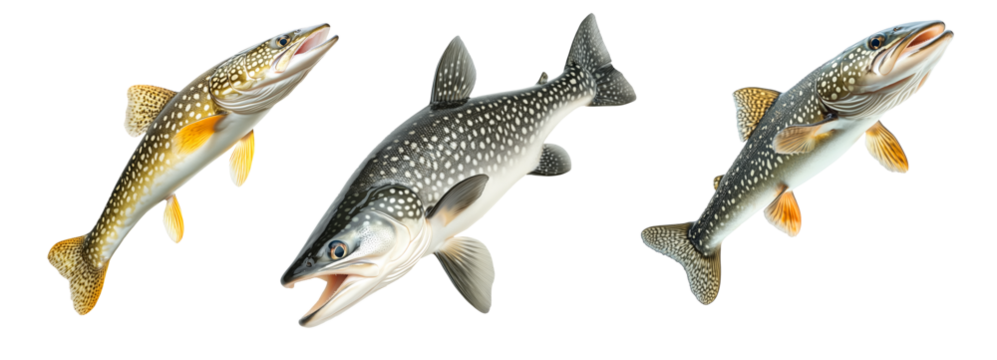 Set of northern pike fish with spotted scales, fins and sharp jaw isolated on white transparent background, concept of aquatic life