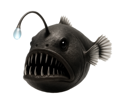 Menacing deep sea anglerfish monster with bioluminescent lure. fierce underwater predator with sharp teeth and glowing eye, isolated