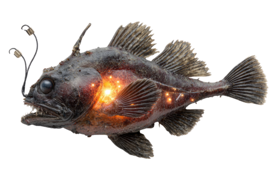 Side view of a bioluminescent anglerfish swimming in the dark, isolated on transparent background
