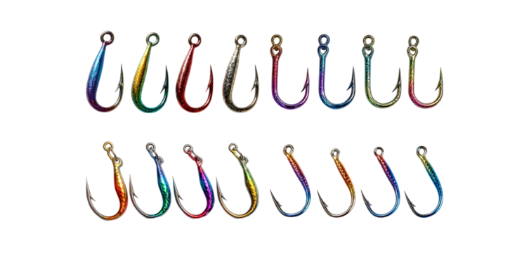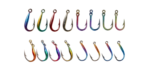 Pack of Vibrant Fishing Hooks Colorful Selection for Anglers against transparent Background