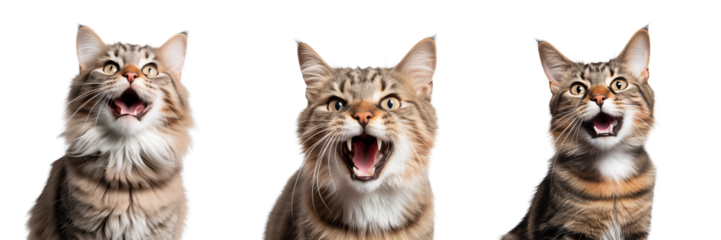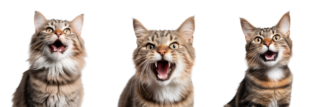 Angry and surprised cat isolated on transparent png background with a funny and excited expression.