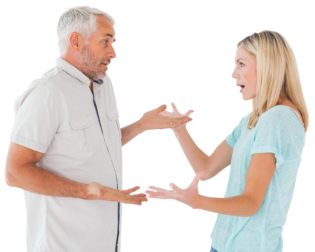 Frustrated couple in mid argument on transparent background