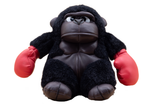 Stuffed gorilla boxer with angry face and red boxing gloves on a transparent background. Boxing and fighting concept