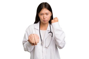 Young asian doctor woman holding a brain isolated showing fist to camera, aggressive facial expression.