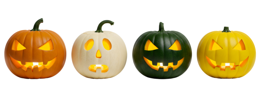 Eight lit Jack O'Lanterns with spooky, evil faces on a white background.