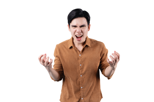 Business man, phone and shout or angry about communication or voice command. Corporate male person isolated on a transparent, png background with a smartphone and stress for bad deal or connection