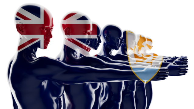 Sequential Mannequins Merging from UK to Anguilla Flag Colors and Emblem