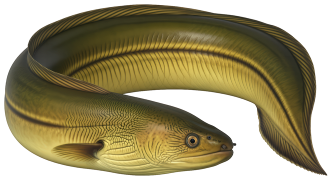 European Eel (Anguilla anguilla), a long, snake-like freshwater fish with a smooth body. PNG with transparent background