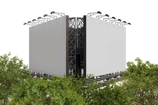 A large, blank, double-sided billboard stands atop a metal framework, partially obscured by lush green foliage.  The structure is angular and imposing, suggesting a robust outdoor advertising display