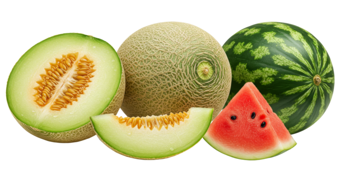 A closeup of fresh and juicy watermelon slices isolated on a clean white background