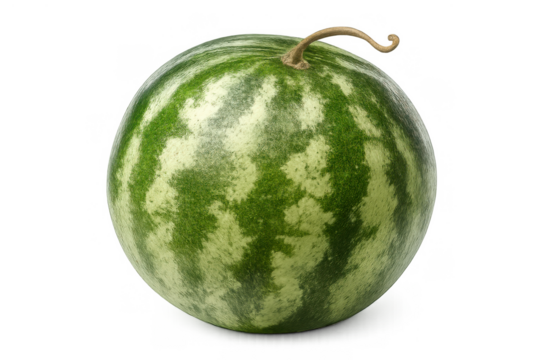 Whole fresh watermelon with green striped skin and tendril, hydrating summer fruit on transparent background