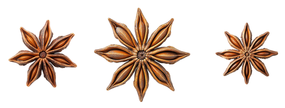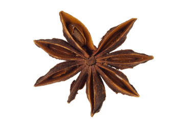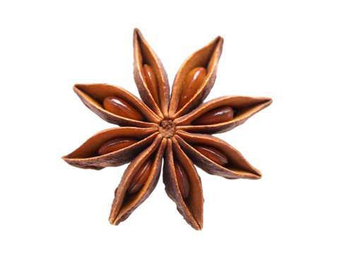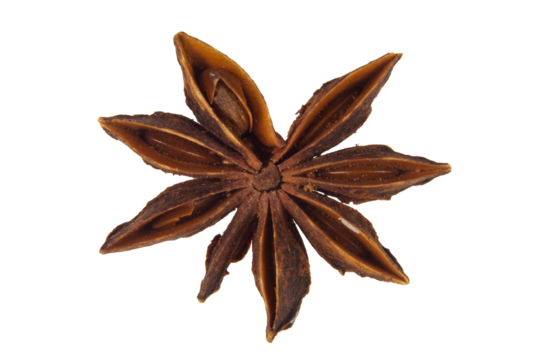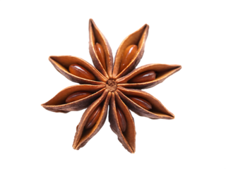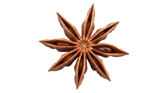 Star anise pod with a distinctive shape, used in culinary dishes and aromatic blends, studio view, isolated on transparent background.
