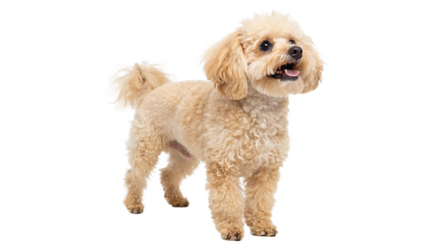 Happy small dog standing showcasing its fluffy fur and playful character in a bright indoor setting On a transparent background
