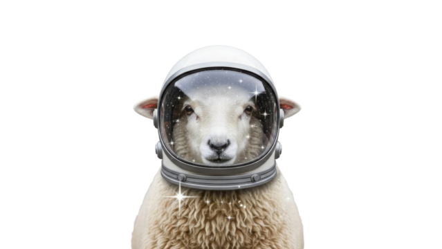 Surreal Sheep Head Wearing a White Astronaut Space Helmet isolated PNG with Transparent Background