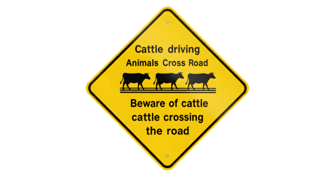 Cattle driving road sign isolated on white background, yellow diamond traffic warning sign with black cow silhouette, animals crossing caution, farm livestock safety, rural transportation symbol