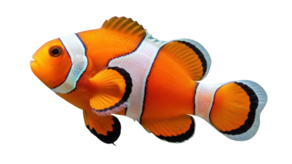 Orange clownfish PNG isolated on transparent background, vibrant tropical reef fish with distinctive white stripes and black markings, marine wildlife