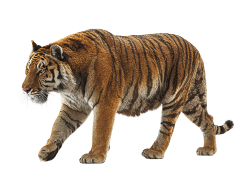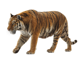 Majestic tiger in its full glory, showcasing its orange and black stripes. The big cat is captured in a confident pose, capturing its power and grace Isolated Transparent Background, PNG