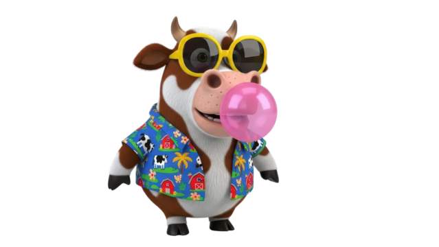 Isolated 3D Cartoon Cow Character in Summer Hawaiian Shirt Blowing Pink Bubble Gum isolated PNG with Transparent Background