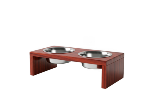 Wooden elevated dog food bowl stand with two stainless steel pet bowls isolated on transparent background