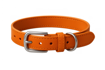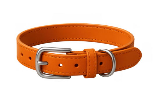 Orange leather pet collar with metal buckle, d-ring, and stitching, providing safety and style for dog accessories