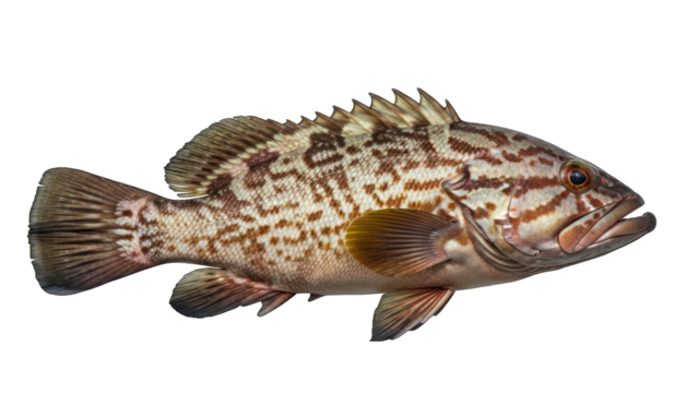 Side profile of a colorful, mottled fish with spiky dorsal fins and vibrant patterns
