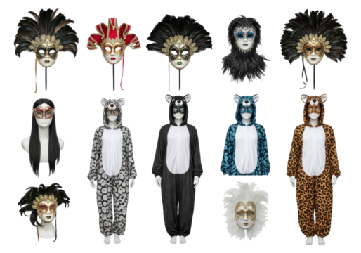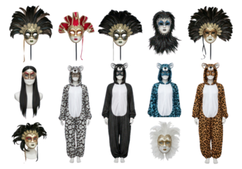 A collection of decorative masks and animal-themed costumes, ideal for masquerade balls or themed parties.