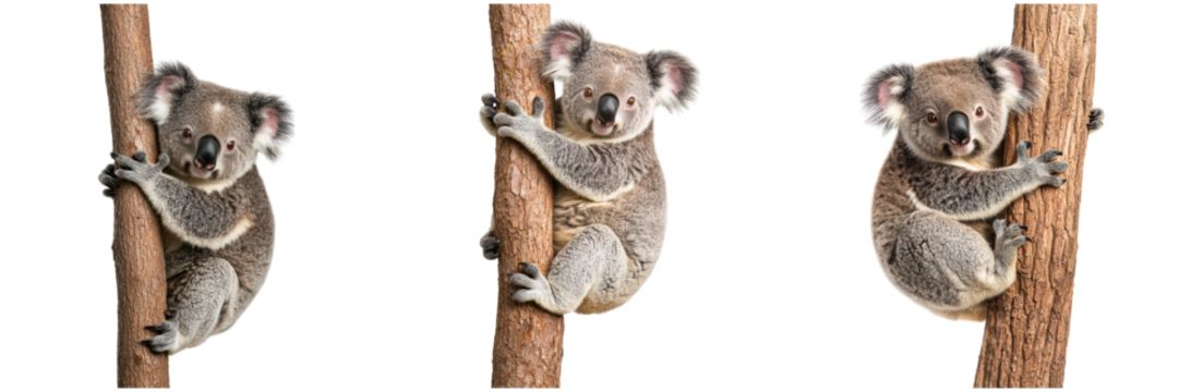 Three koalas climbing on tree trunks. Isolated on white background.