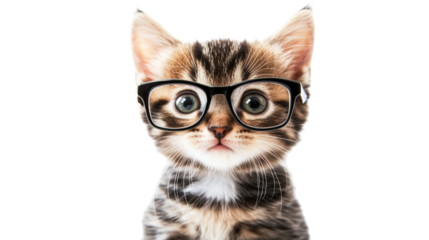 Kitten wearing black framed glasses isolated on a transparent background