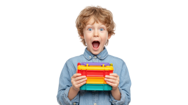 A joyful child with curly hair holding a colorful toy, expressing surprise and excitement against a white background.