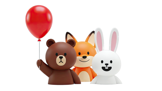 Cute 3D animated bear, fox, and rabbit with a red balloon